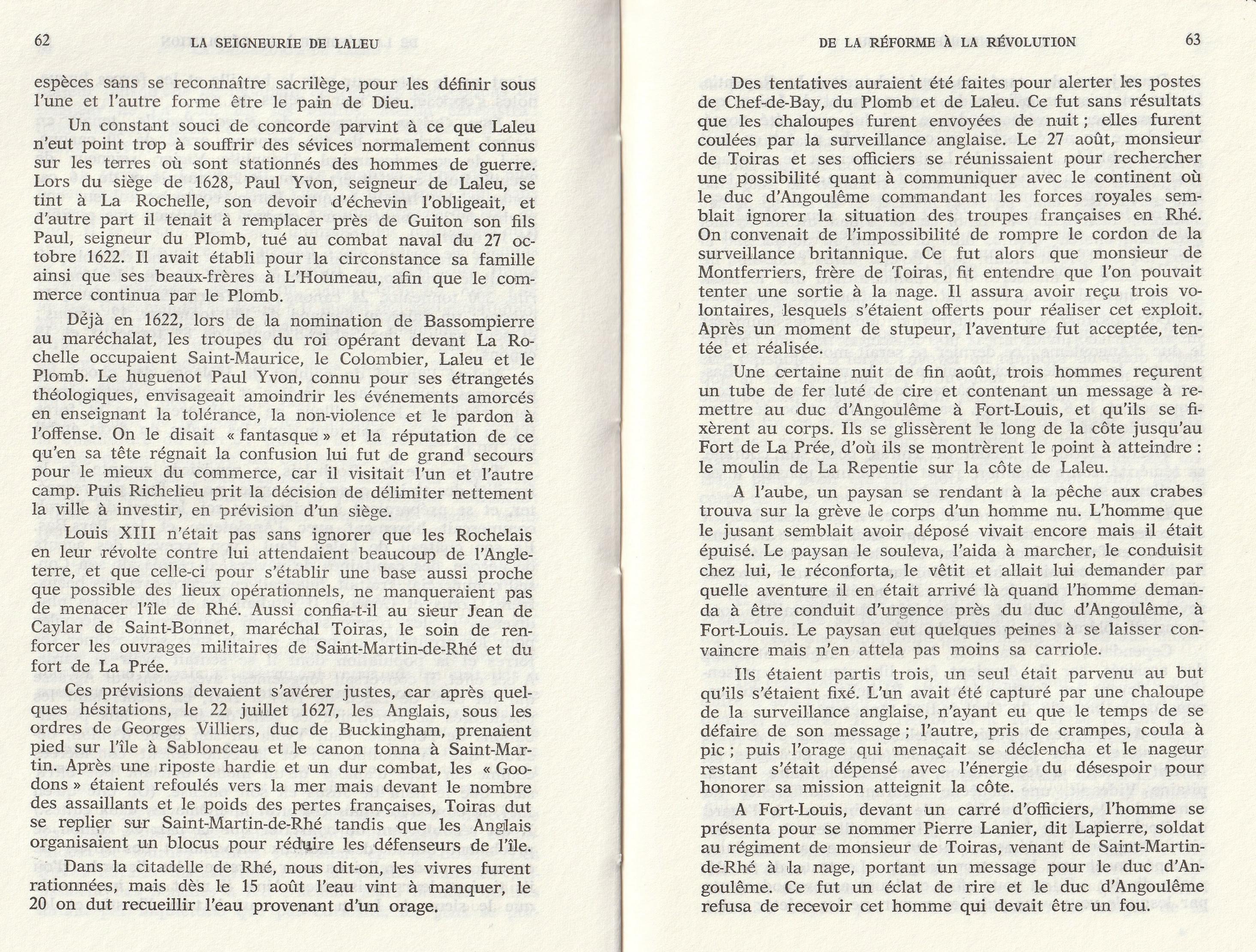 Nous avons des ancêtres bien plus méritants, prenez le temps de lire l’extrait du Livre de H. Simoneau paru en 1983 aux Editions Rupella, : La seigneurie de Laleu. Il rapporte une Traversée qui a eu lieu ... une certaine nuit de fin août 1627, pendant le siège de La Rochelle. Pour transmettre un message des troupes du Maréchal Toiras, assiégées par les anglais à Saint Martin de Ré, trois soldats partirent du Fort de La Prée pour joindre le duc d’Angoulême à Fort- Louis. Un seul parvint à la Plage de la Repentie, sain et sauf.