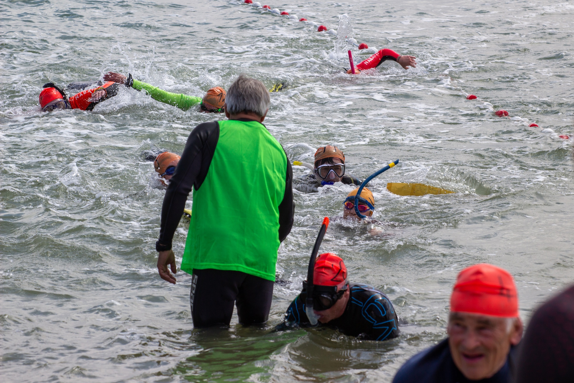 Une attention particulière est réservée à la sécurité des nageurs.Le premier niveau c’est bien entendu la forme physique des participants, qui doit être attestée par un certificat médical à jour, et leur niveau d’entraînement (engagement sur l’honneur, lors de l’inscription, d’avoir réalisé au moins une sortie en mer de 2000 m en nage avec palmes). Ensuite viennent les moyens mis en œuvre par l’organisation avec huit bateaux type semi-rigides et huit kayaks, qui encadrent le peloton des nageurs, prêts à leur porter secours en cas de défaillance. Le suivi des participants se fait grâce à des bonnets de couleur vive, portant un numéro, qui équipent chacun d’eux et qui permettent une identification rapide des uns et des autres à l’arrivée. Le plus souvent la brigade de gendarmerie maritime de La Rochelle vient renforcer notre dispositif. La présence d’un médecin de la course et de sauveteurs de la sécurité civile, assurent un premier niveau d’intervention en cas de nécessité. Comme tous les évènements en extérieur, La Traversée est soumise aux caprices de la météo. Le vent ou l’état de la mer sont susceptibles de perturber l’évènement, voir obliger à son annulation. Le moindre clapot est déjà un frein à la visibilité des nageurs et donc à leur capacité à garder le cap, alors évidemment si la mer se creuse… Le vent, lui, a un impact direct sur la performance selon qu’il soufflera, même faiblement, d’ouest ou d’est le temps pour traverser ne sera pas le même. En moyenne les meilleurs approchent les 30 minutes, il faut 1h30, environ, pour les derniers. La préfecture maritime nous fixe des limites : le vent ne doit pas dépasser force 4 et l’état de la mer force 3 (soit une mer peu agitée) pour que le départ puisse être envisagé. D’autres évènements indépendants de la volonté des organisateurs peuvent amener à prendre la décision d’annuler, exemple : si les kayaks estiment ne pas pouvoir assurer leur mission de sécurité dans des conditions convenables. Merci de vous reporter aux règlement de La Traversée pour les détails.